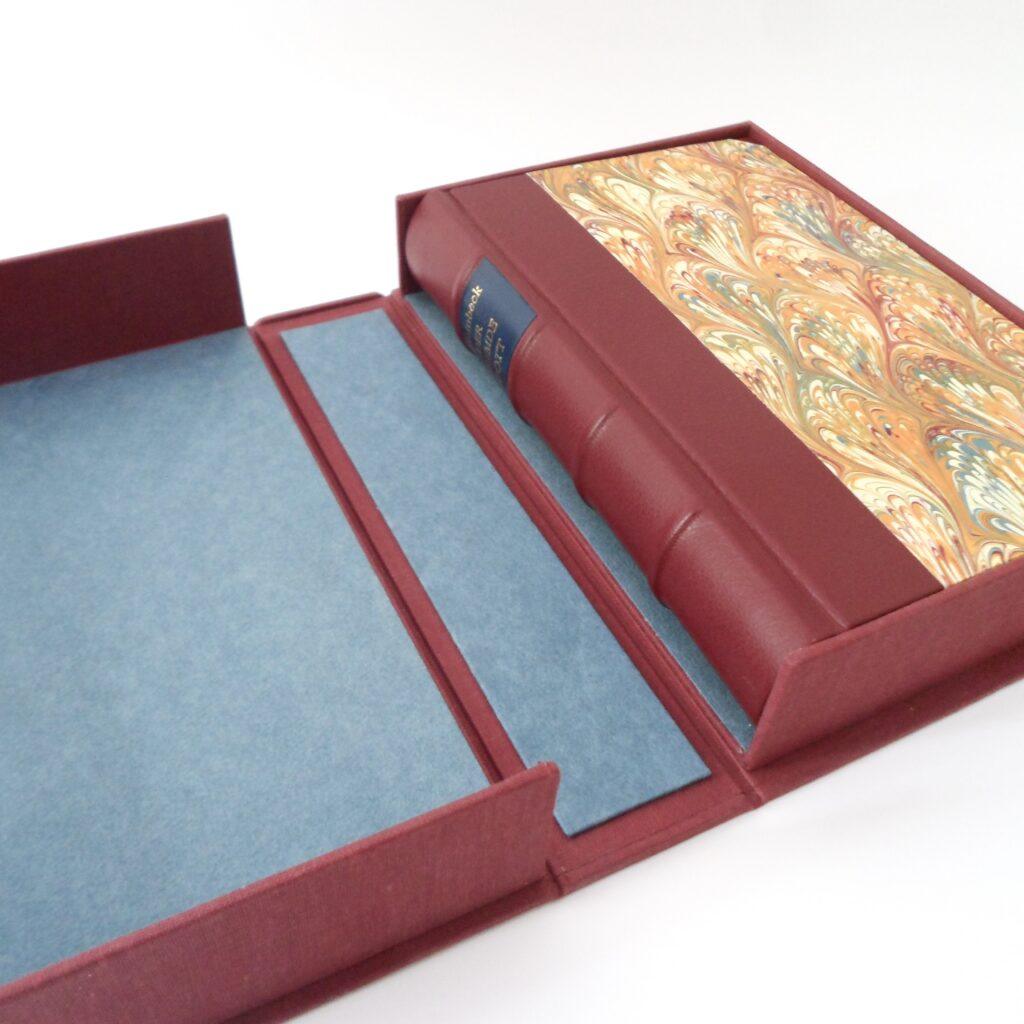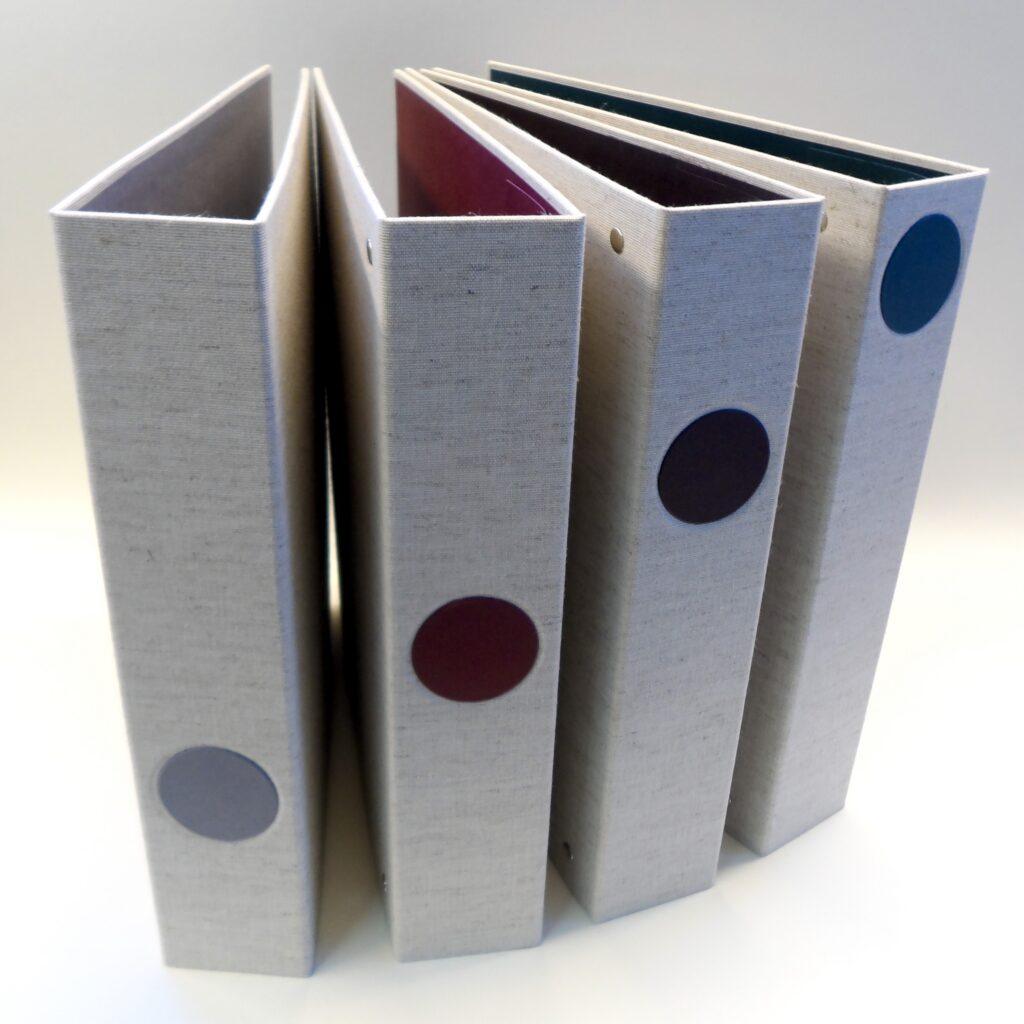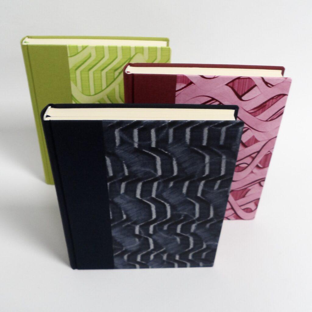 Wählen Sie Ihre Lieblingsfarbe aus einem Sortiment von textilen Einbandmaterialien aus. Außerdem gibt es verschiedene Buntpapiere, die mit Gewebe und Leder kombinierbar sind.