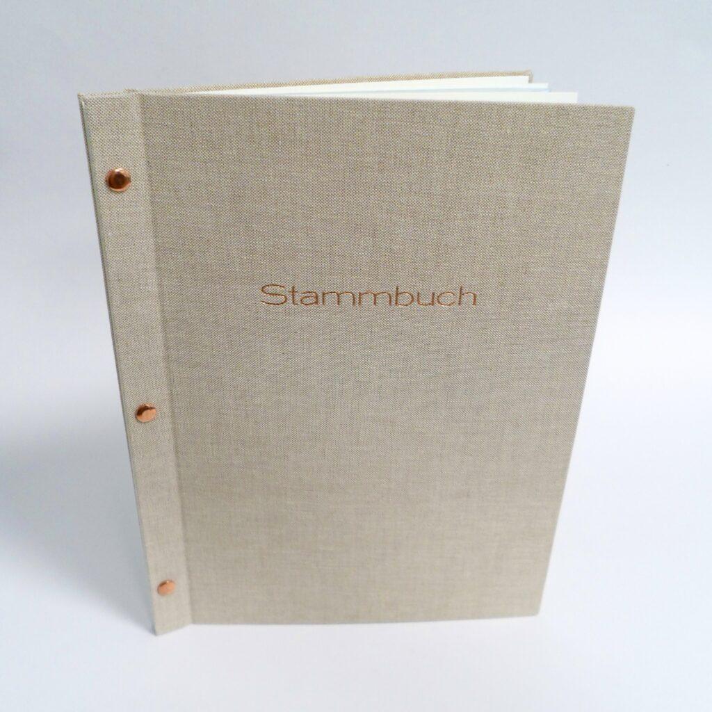 Einzelstücke, die für eine bestimmte Person oder einen Anlass angefertigt werden, lassen sich auf unterschiedliche Weise individualisieren. Durch eine Prägung mit dem Namen, den Initialen, einem Datum oder einem aussagekräftigen Titel. Sie können zwischen verschiedenen Schriftarten auswählen, oder einen Prägestempel anfertigen lassen. Prägungen mit Metallfolien in Gold und Silber sehen sehr edel aus. Aber auch ein Abdruck mit Farbfolie oder eine dezente Blindprägung kann man gestalterisch gut einsetzen.
